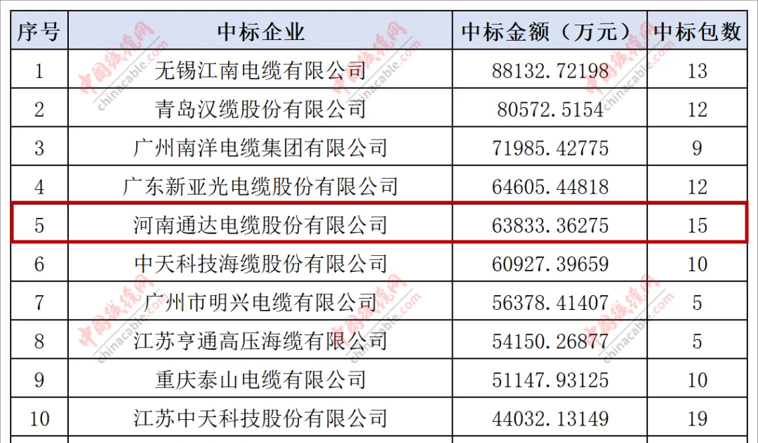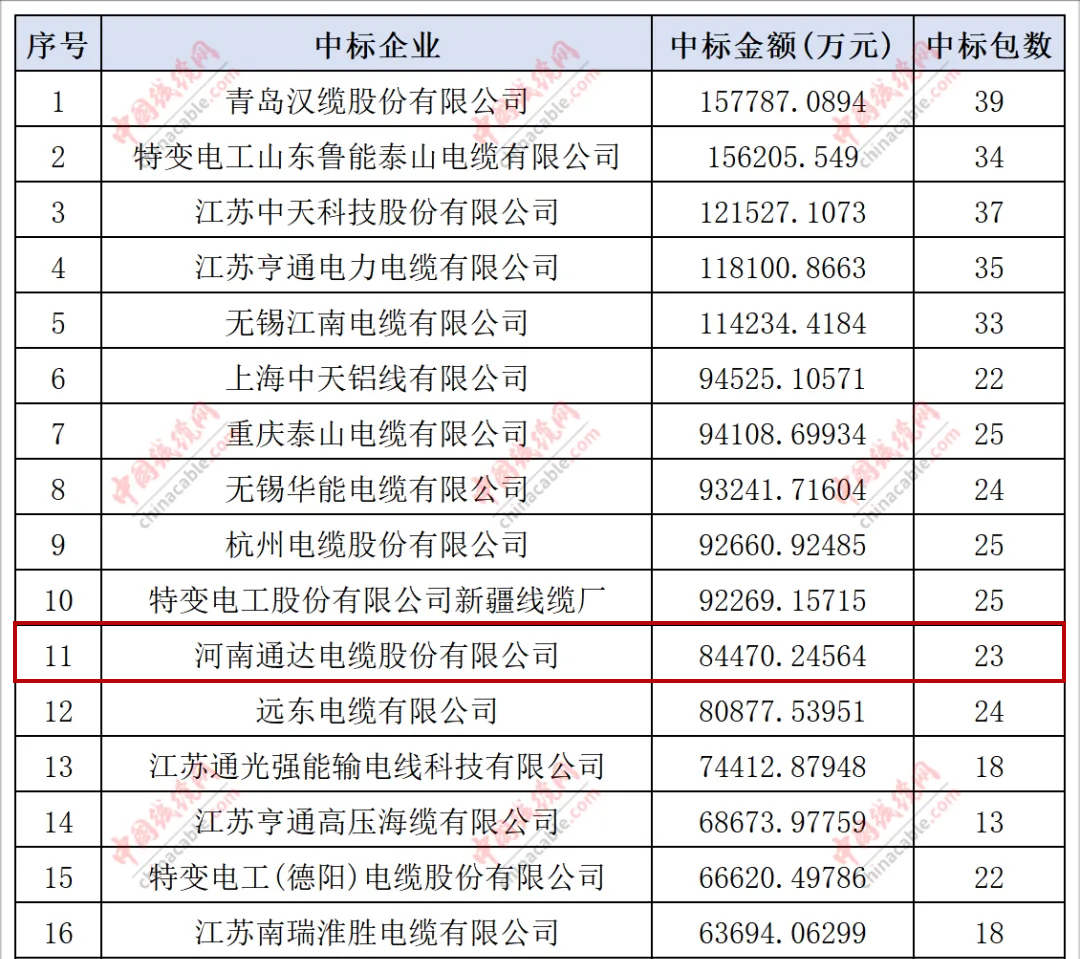 電線(xiàn)電纜被譽(yù)為國(guó)民經(jīng)濟(jì)的“血管”與“神經(jīng)”,在確保我國(guó)電力穩(wěn)定供應(yīng)、促進(jìn)經(jīng)濟(jì)穩(wěn)健增長(zhǎng)以及提升能源使用效率方面發(fā)揮著舉足輕重的作用。截至2024年12月31日,國(guó)家電網(wǎng)總部和南方電網(wǎng)有限公司的2024年度線(xiàn)纜物資招標(biāo)采購(gòu)項(xiàng)目結(jié)果已全面公布,通達(dá)股份在2024年國(guó)家電網(wǎng)、南方電網(wǎng)總部線(xiàn)纜物資中標(biāo)線(xiàn)纜企業(yè)排行榜中表現(xiàn)卓越,分別榮獲第11名和第5名。