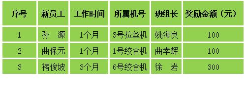 絞合車間:6號絞合機員工在本月工作中在質量、生產(chǎn)、7S方面表現(xiàn)突出被公司評為優(yōu)秀三好班組:共8人(張丙亮 李奇杰 褚俊坡 魏小科 趙紅星 李建剛 曲帥鵬 王利明)。