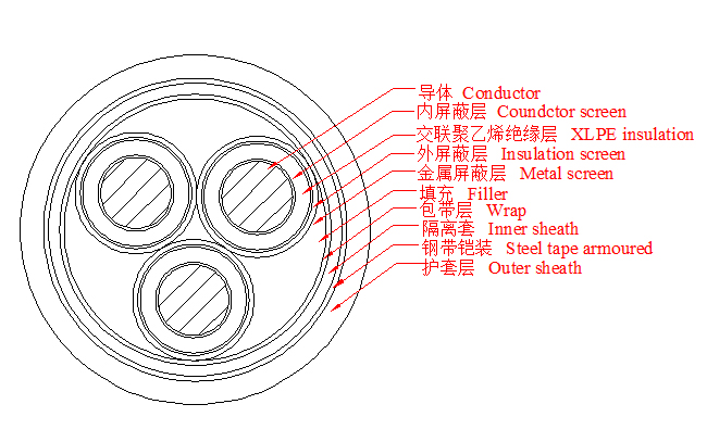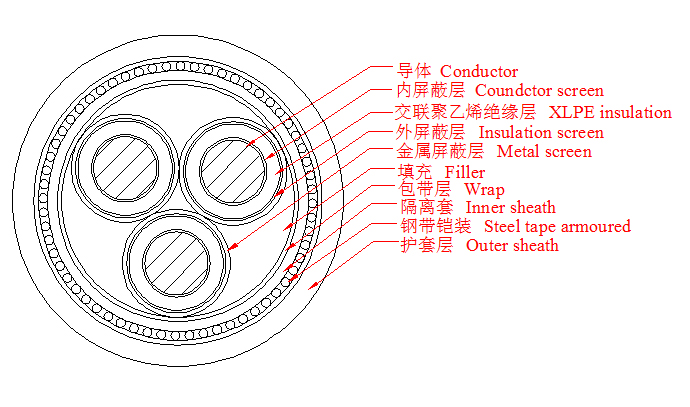3.6/6~26/35kV三芯交聯(lián)聚乙烯絕緣鋼帶鎧裝電力電纜產(chǎn)品結構示意圖