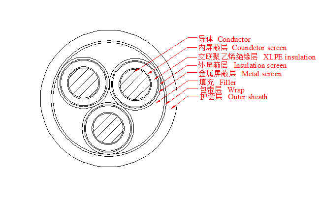 3.6/6~26/35kV三芯交聯(lián)聚乙烯絕緣電力電纜產(chǎn)品結構示意圖